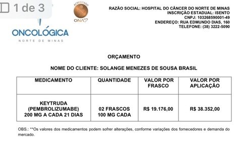 Minha mãe, Solange, está enfrentando um câncer no estômago e precisa urgentemente de imunoterapia. Esse tratamento inovador vem auxiliando muitas pessoas, mas não é fornecido pelo SUS sem decisão judicial — um processo que leva tempo que não temos. Para começar o quanto antes, precisamos adquirir imediatamente a dose inicial, conforme o orçamento.