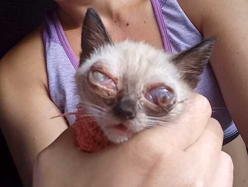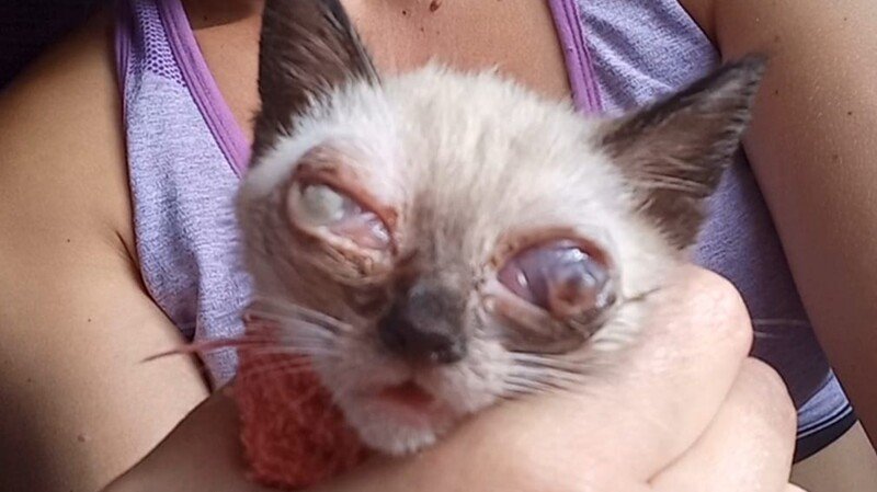 Ela foi encontrada com uma infecção grave nos olhos, já em estado avançado. Infelizmente, um dos olhinhos acabou rompendo antes mesmo de conseguirmos atendimento veterinário imediato.