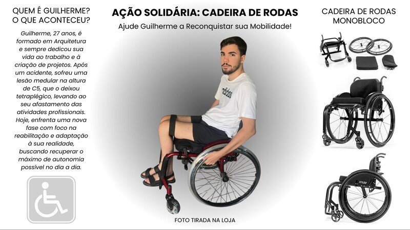 Guilherme sofreu um acidente que o deixou tetraplégico. Ao sair do hospital, utilizou uma cadeira de rodas emprestada pelo governo, mas o prazo de uso já expirou. Agora, ele precisa de uma cadeira de rodas monobloco feita sob medida (indicação dos profissionais da saúde), com largura e centro de gravidade ajustados ao seu corpo. Como ele possui pouca força nos braços, a cadeira precisa ter estrutura em material leve, que também possa ser desmontada para facilitar o transporte. No entanto, um equipamento com todas essas características exige um investimento alto. Contamos com a sua ajuda para que o Guilherme possa continuar evoluindo em sua reabilitação.