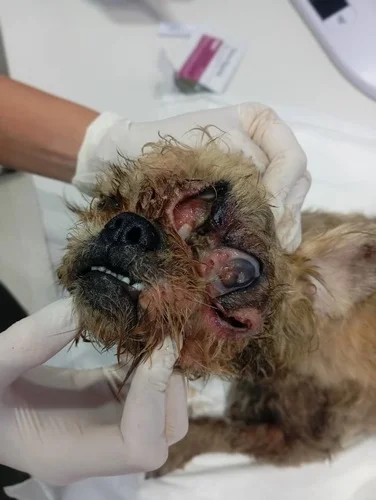 Teteco, um cãozinho muito carinhoso da raça shihtzu, foi abandonado nessas condições